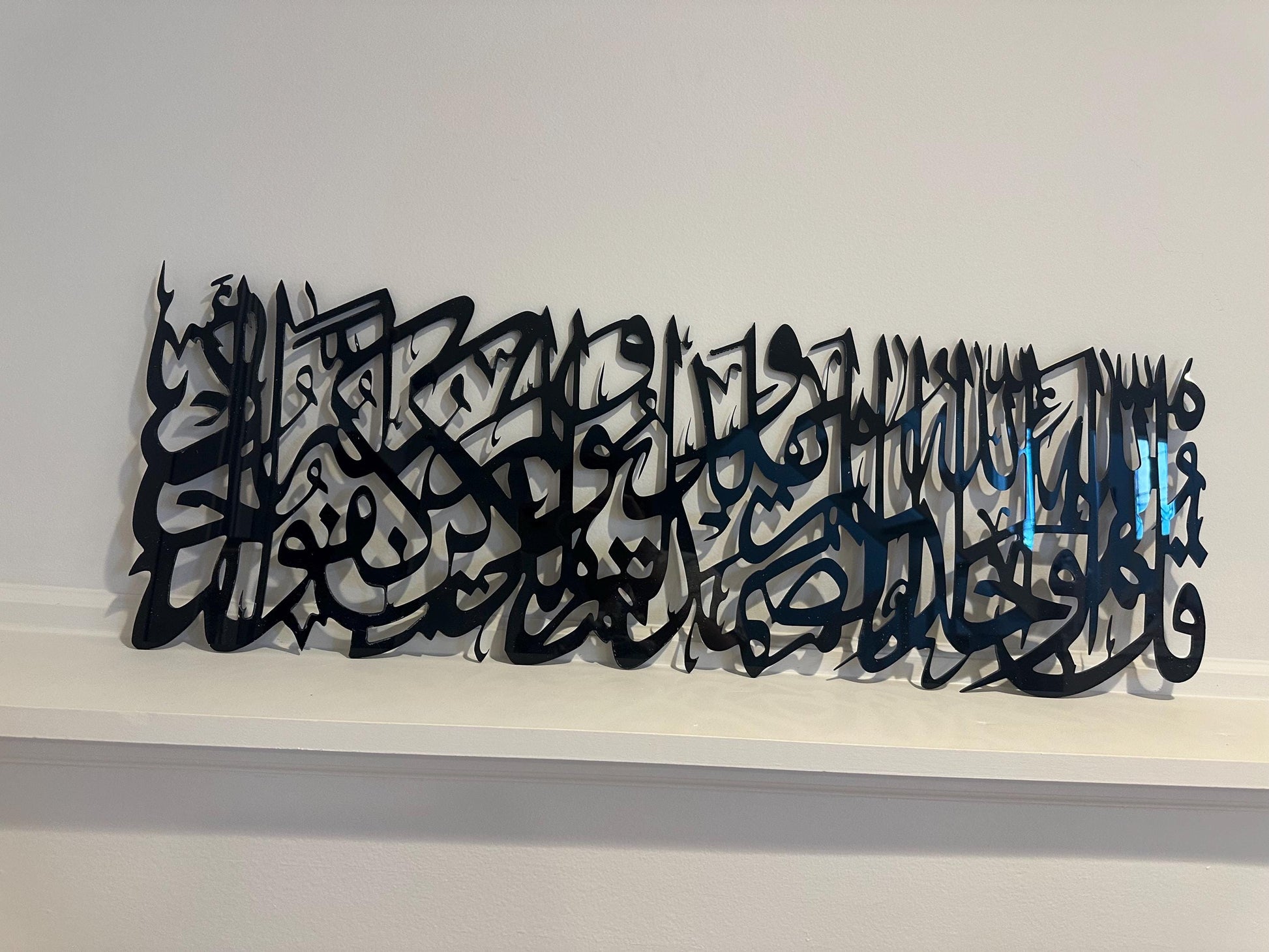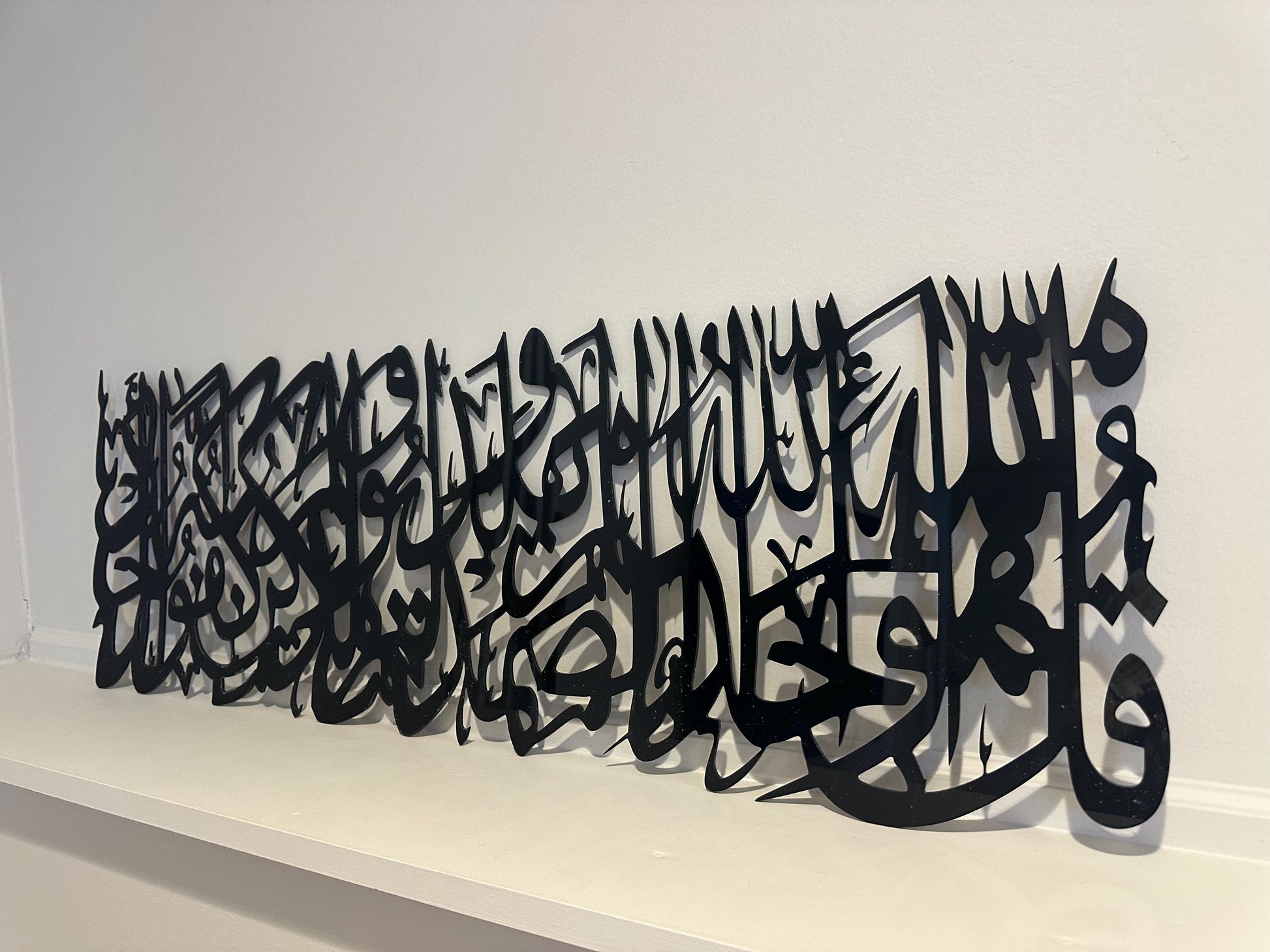 This Unique Islamic Piece is made with All Acrylic and the Sizes are 35x12 inches and If you would like it in a bigger size or Smaller size Feel free to contact me or in a different Surat or Dua or Calligraphy The thickness Of the Acrylic is 3MM or 0.12 inches Shipping is Free