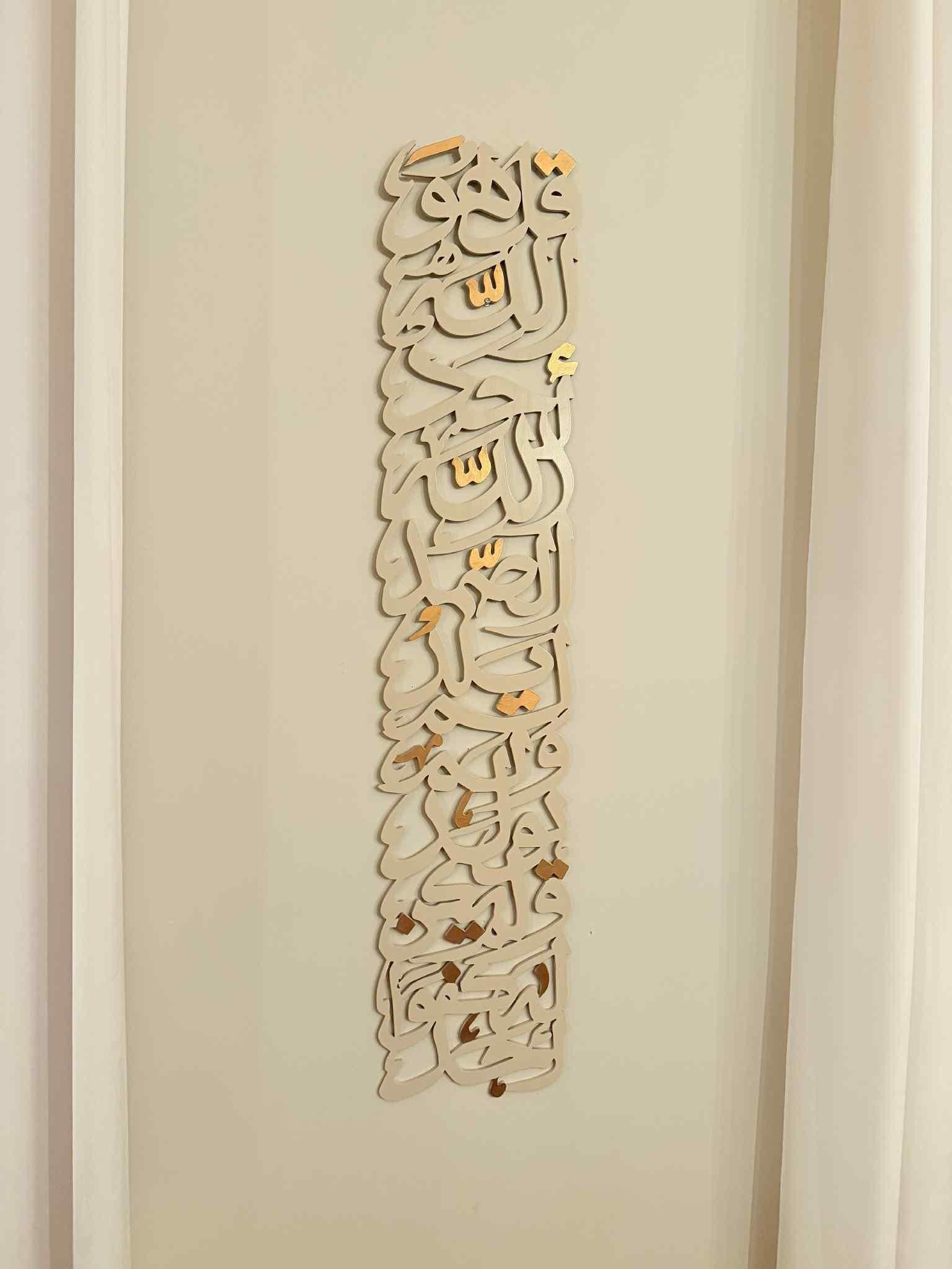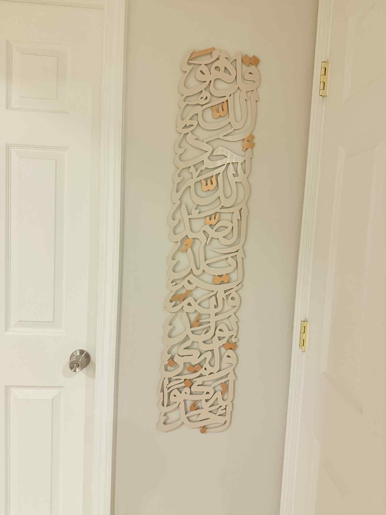 Bring elegance and spirituality into your home with this stunning vertical Surah Al-Ikhlas wall art, beautifully crafted in Arabic calligraphy. Measuring 45 inches in height and 12 inches in width, this statement piece is designed to stand tall and gracefully transform any wall in your home.