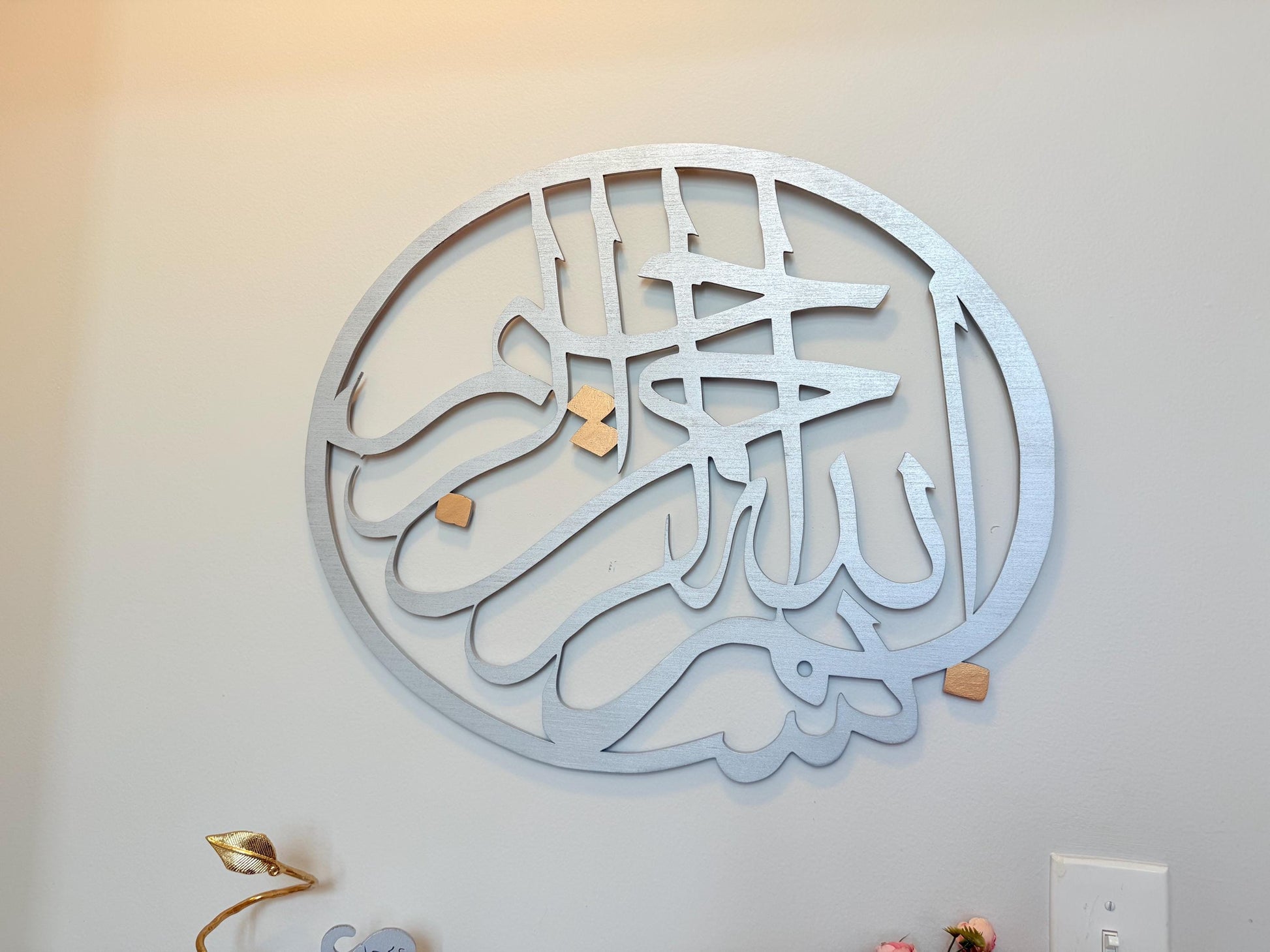 This special piece is 25x22 inches with a thickness of 0.25 inch wood This piece says بسم الله الرحمن الرحيم