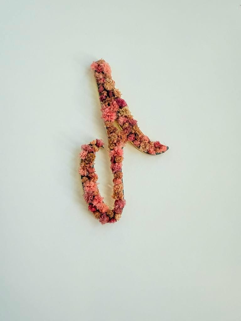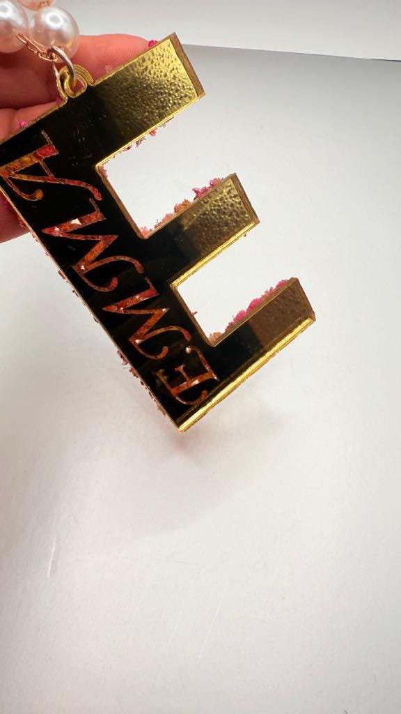 Add a personal and stylish touch to your car with this custom acrylic car hanging charm. Each piece is shaped as a bold gold mirror acrylic letter of your choice, beautifully decorated with real dried pink flowers and pearl accents for a unique, modern look. Measuring approximately 3 x 1.75 inches, it's the perfect size to hang from a rearview mirror without obstructing your view.