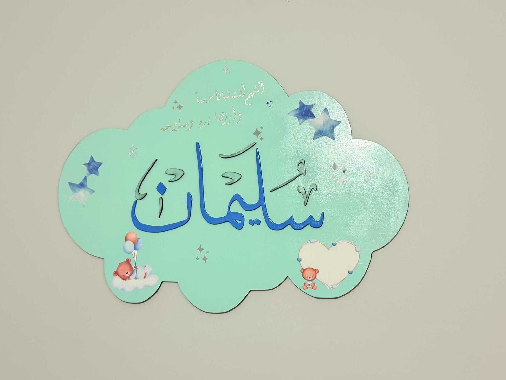 Celebrate the arrival of a new blessing with this custom Arabic baby name sign, beautifully crafted from sturdy 1/4 inch wood and available in soft blue or pink. Shaped like a cloud, this unique piece features the baby’s name in Arabic calligraphy along with a heartfelt duʿāʼ at the top: "اللهم أنبته نباتاً حسناً وأرزقنا بره وصلاحه" – “O Allah, raise him well, and bless us with his goodness and righteousness.” Measuring approximately 26 inches wide, it makes a charming addition to any nursery or a meaningful gift for a baby shower, aqeeqah, or birth celebration. Each piece is personalized with the name of your choice and ships free within the U.S. If you have any questions or special requests, feel free to reach out anytime!