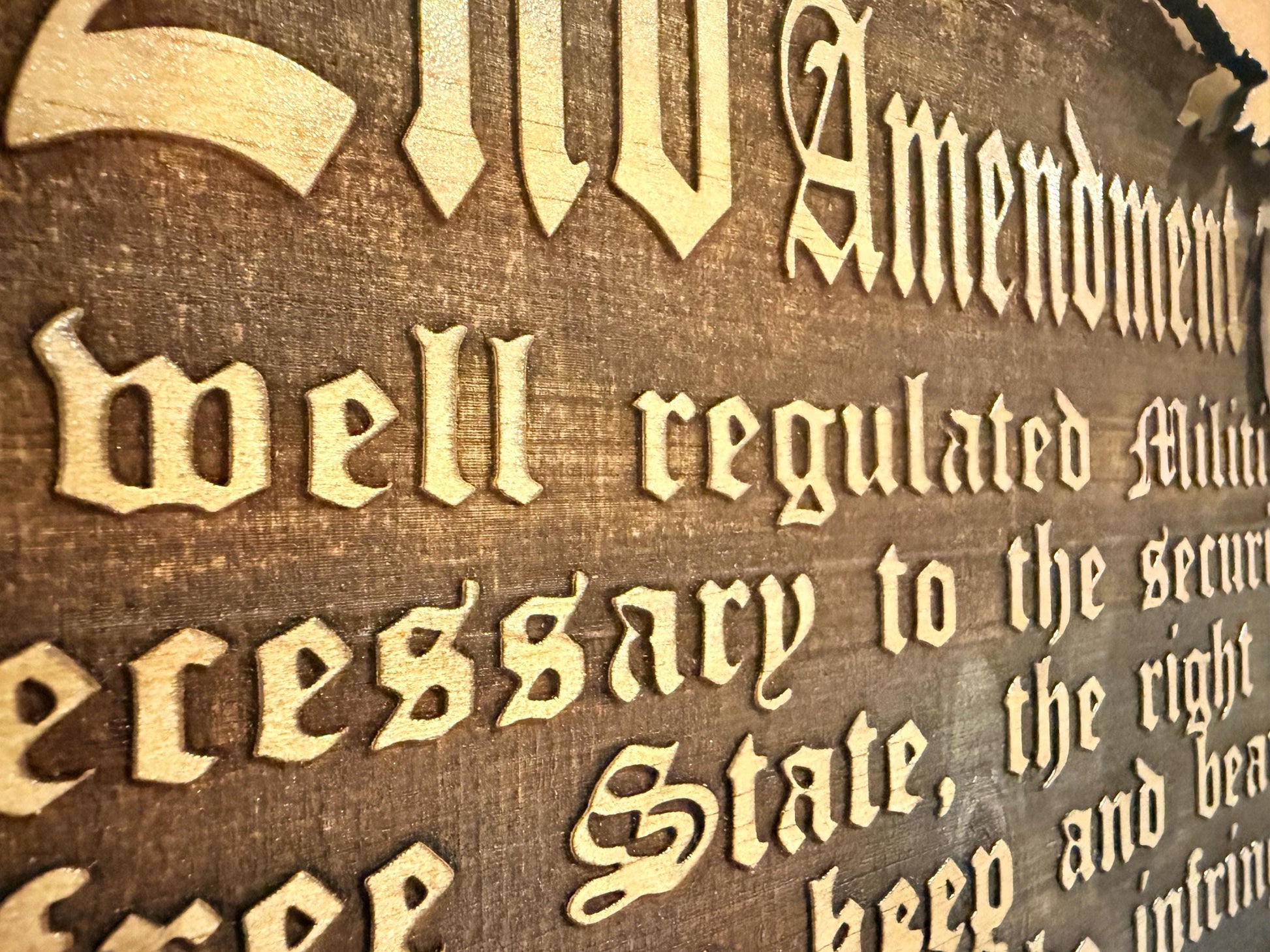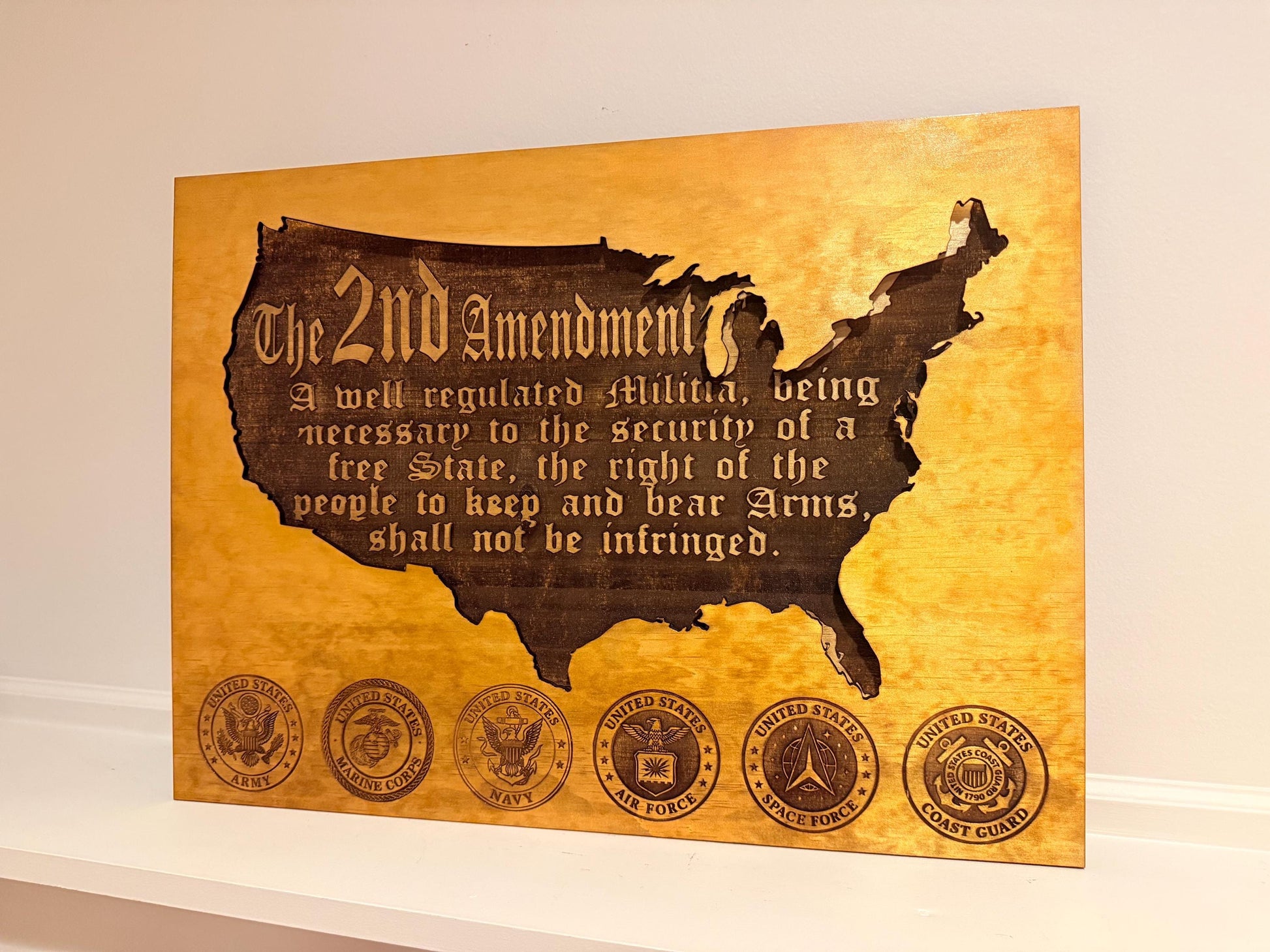 This patriotic wall décor features the full text of the 2nd Amendment engraved inside the outline of the United States, along with the emblems of the Army, Marine Corps, Navy, Air Force, Space Force, and Coast Guard. The built-in LED light system creates a glowing effect at night, making it a bold statement piece for your home.