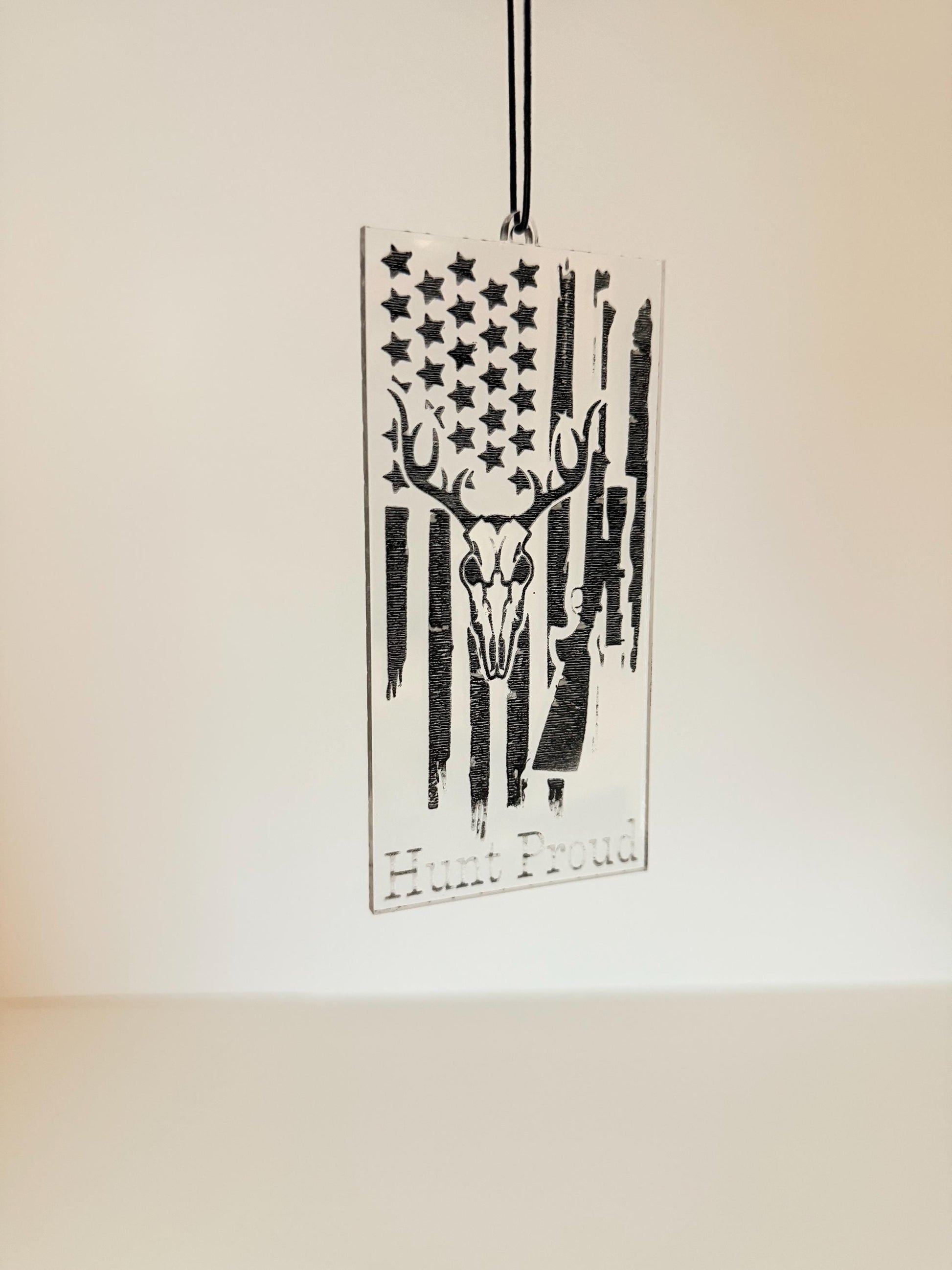 Show your pride wherever you go with this handmade American flag acrylic car charm. Each piece is laser-cut and engraved with a unique patriotic design — perfect for your car, truck, or as a meaningful gift for veterans, hunters, and proud Americans.