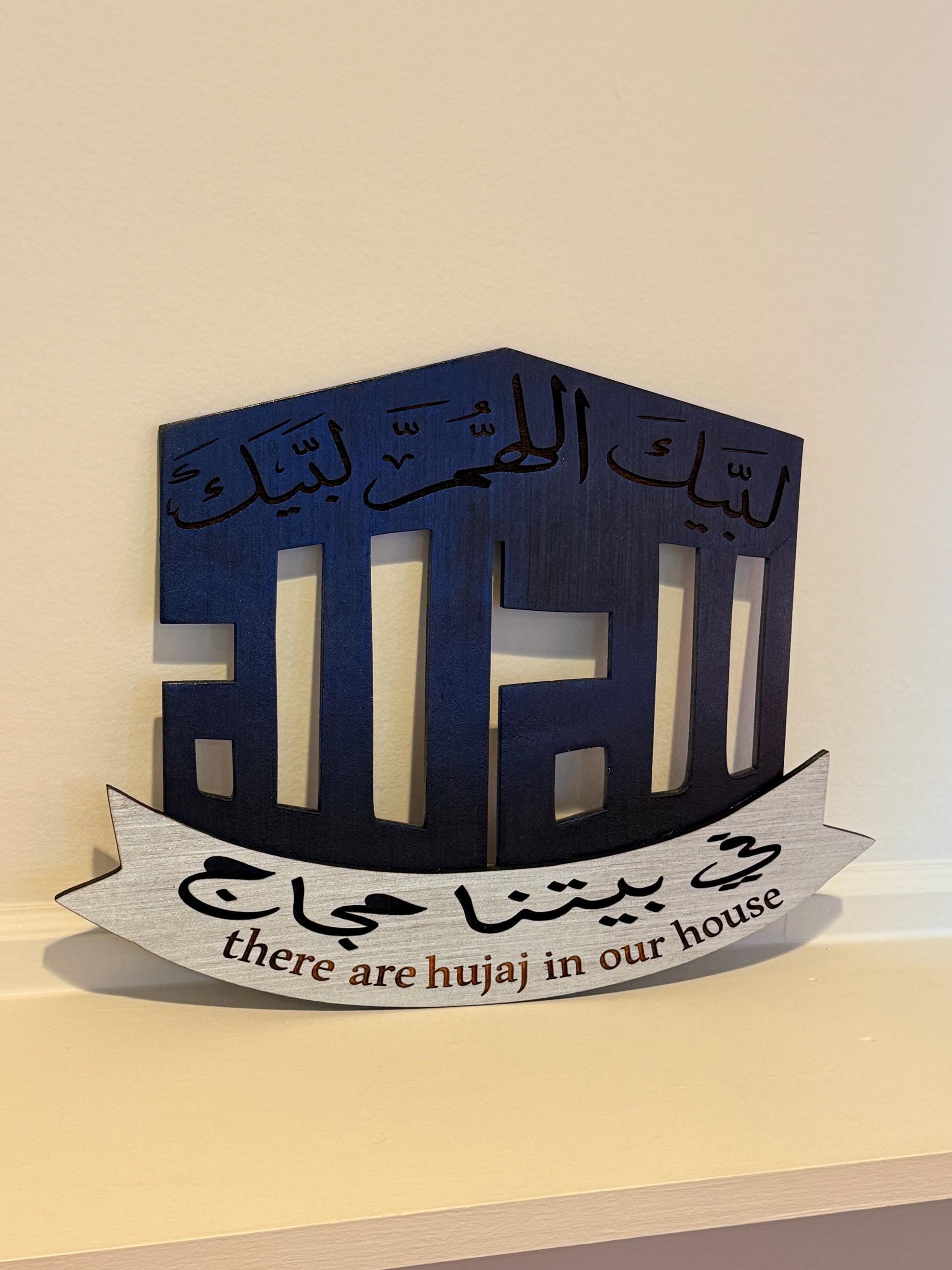 This amazing one of a kind piece is the perfect gift for those coming back from Hajj it says “there are hujaj in our house” in Arabic and english the sizes for this piece 13x11.5 inches and 10 MM thick made out of wood. If you have any questions please feel free to ask.
