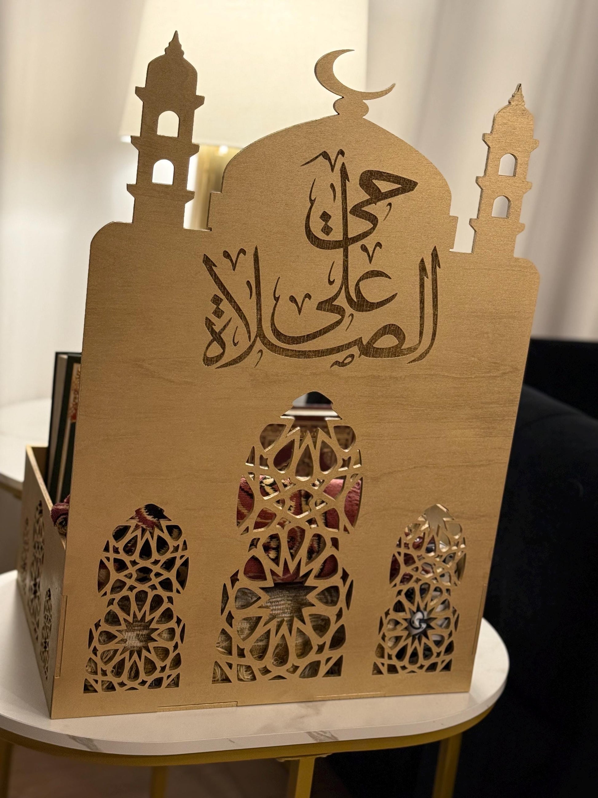 This unique piece is 16x12x24 inches. It comes in 2 colors silver and gold. This piece holds all your islamic necessities and is small in size. If you have any questions feel free to reach out.