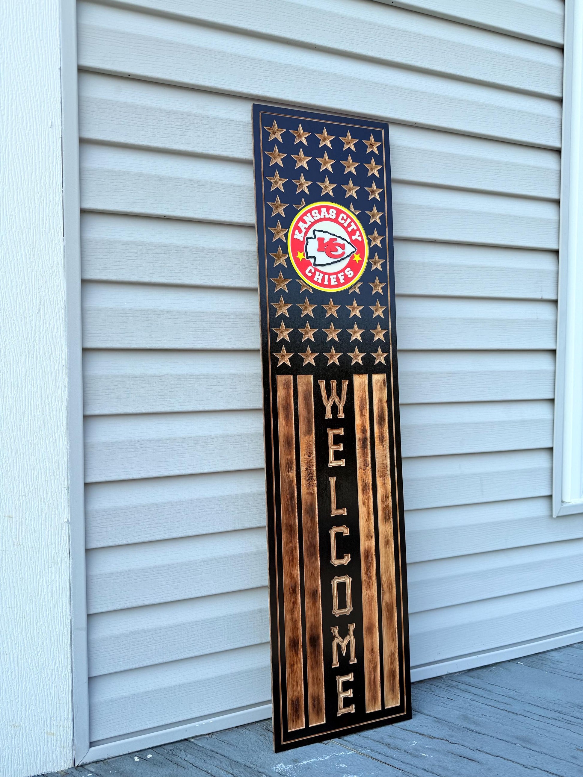 Kansas City Chiefs Wooden Welcome Sign | Rustic USA Flag Decor | Personalized NFL Team Wall Art
