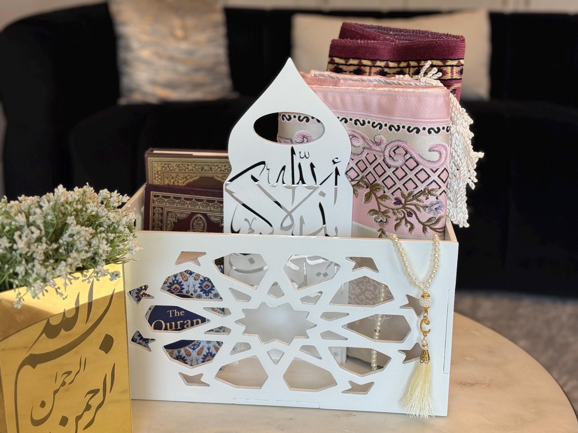 This unique piece combines modern décor with deep spirituality, designed to beautifully hold your Qur’an, prayer mat, tasbih, or other essentials.