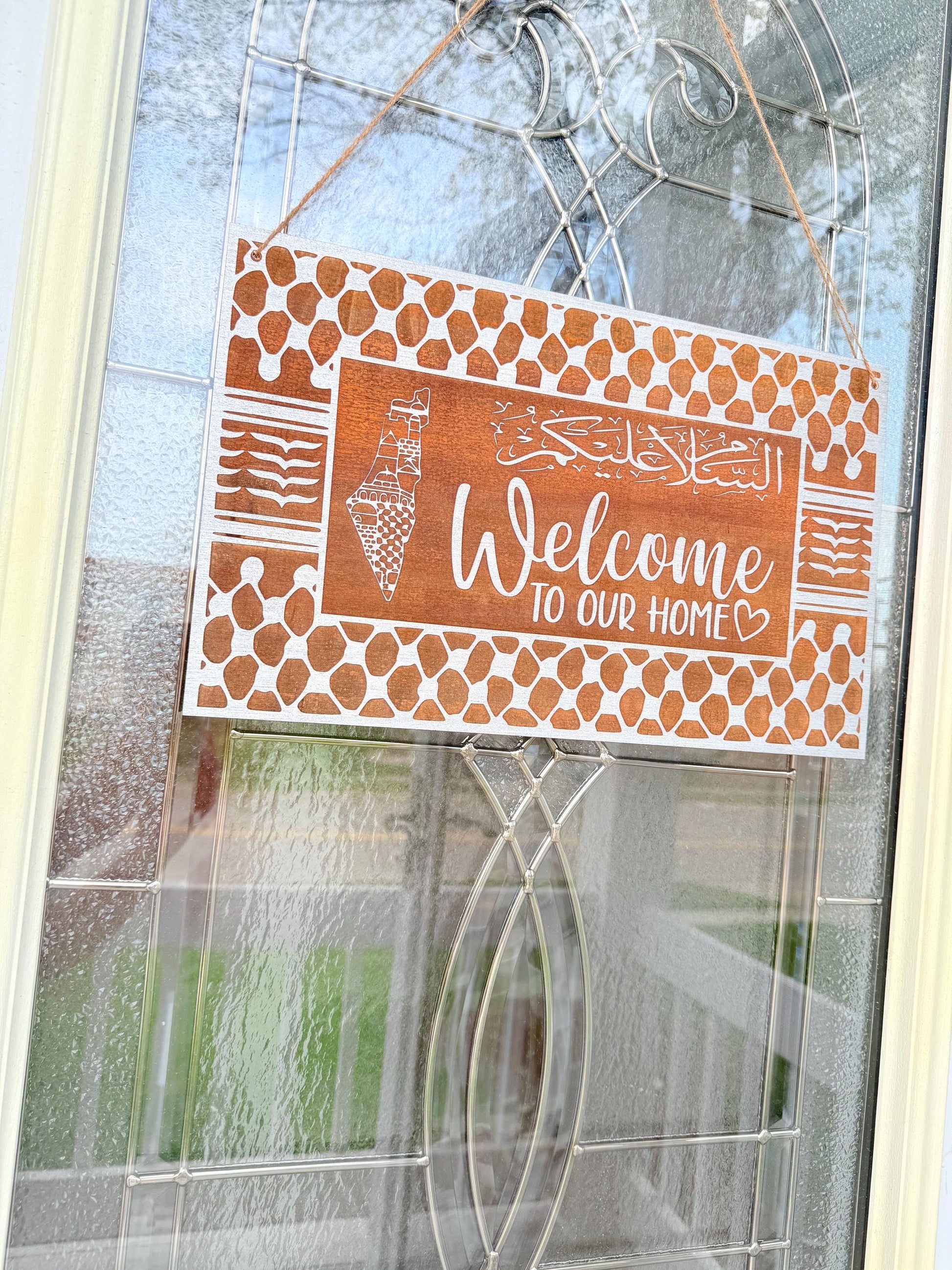 This elegant piece is 17x10x0.2 inches, this piece is a palestine Arabic/English welcoming into someones home as a door hanging. The part in arabic says “assalamalaykum” if you would like a different size or have any questions please feel free to reach out